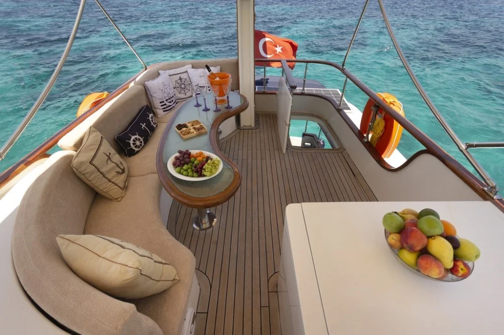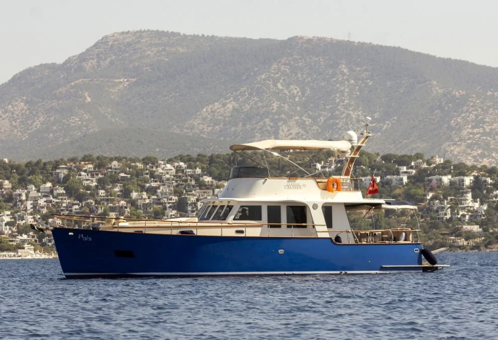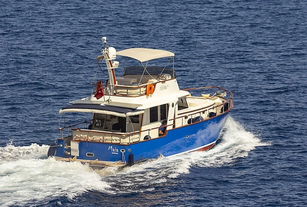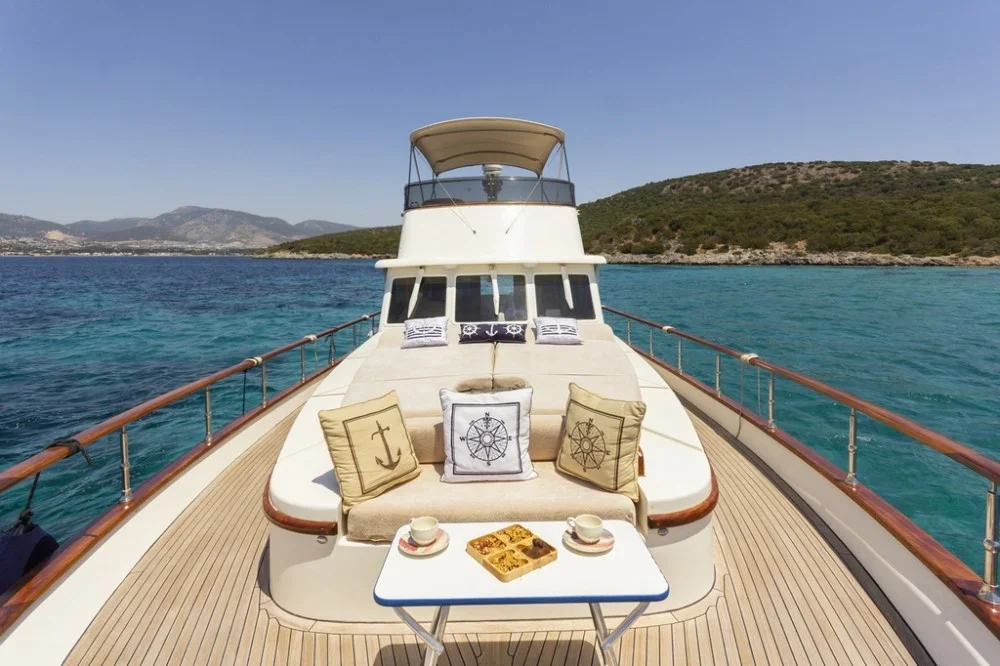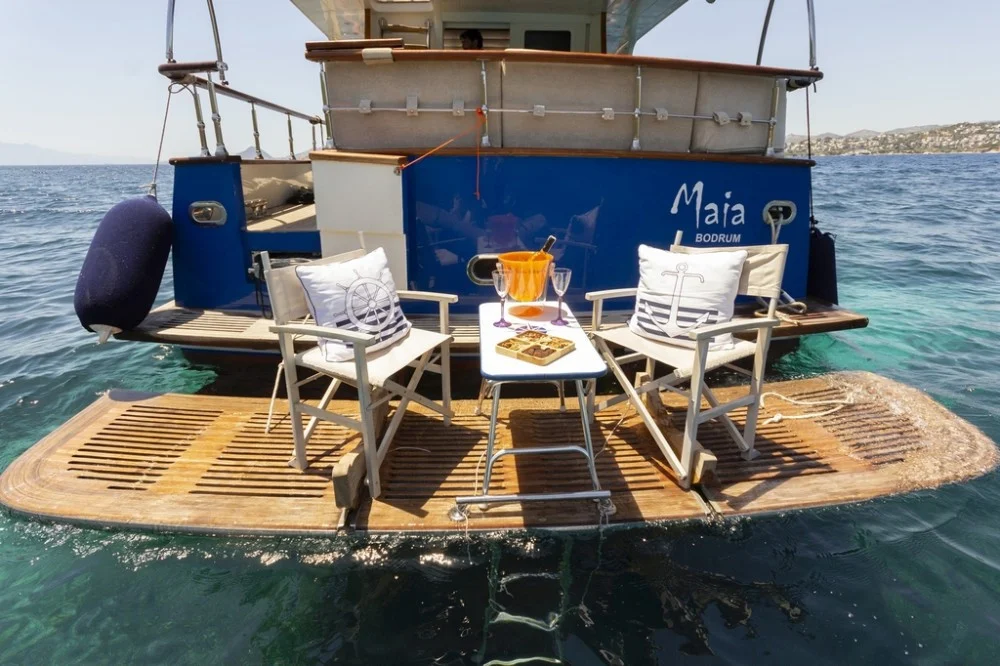 MAIA trawler is a custom-built Classic Cruiser 55 yacht located in the harbour of Bodrum and she is Turkish flagged. With her harmonious exterior and interior design, she is an enchanting trawler. MAIA yacht is ideal for couples and small parties to enjoy their yacht holiday along the Aegean coastline. Her length overall is 17 meters with a beam of 4.60 meters. She owns 2 engines of 265 hp and 2 generators of 17.5 kW. One of the biggest advantages is her platform with a stair that allows easy access to the sea and creates herewith a ‘secret’ sitting area. The sundeck is spacious and offers al fresco dining and sunbeds. Her flybridge is highly recommendable with a relaxing lounge area and 360-degree breathtaking views. MAIA trawler yacht can accommodate 4 guests in 2 comfortable cabins. On the main deck forward is the spacious master cabin with its ensuite bathroom including a shower and WC. The double cabin is perfectly suitable for two guests to accommodate or even for single-use. As for entertainment, the saloon offers a built-in television with IP TV and a DVD player. For other media connections, MAIA yacht offers Wi-Fi onboard. MAIA is very suitable for honeymoon and sunset tours on the boat as well. Please contact us directly for availability and inquiries about trawler yacht MAIA.