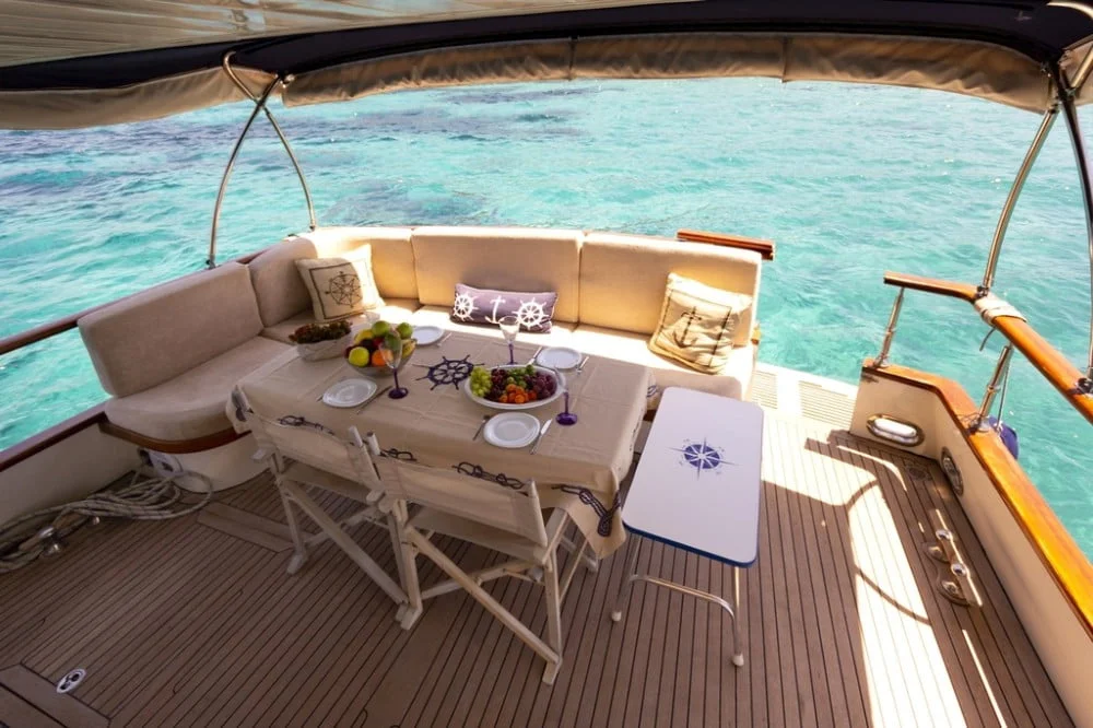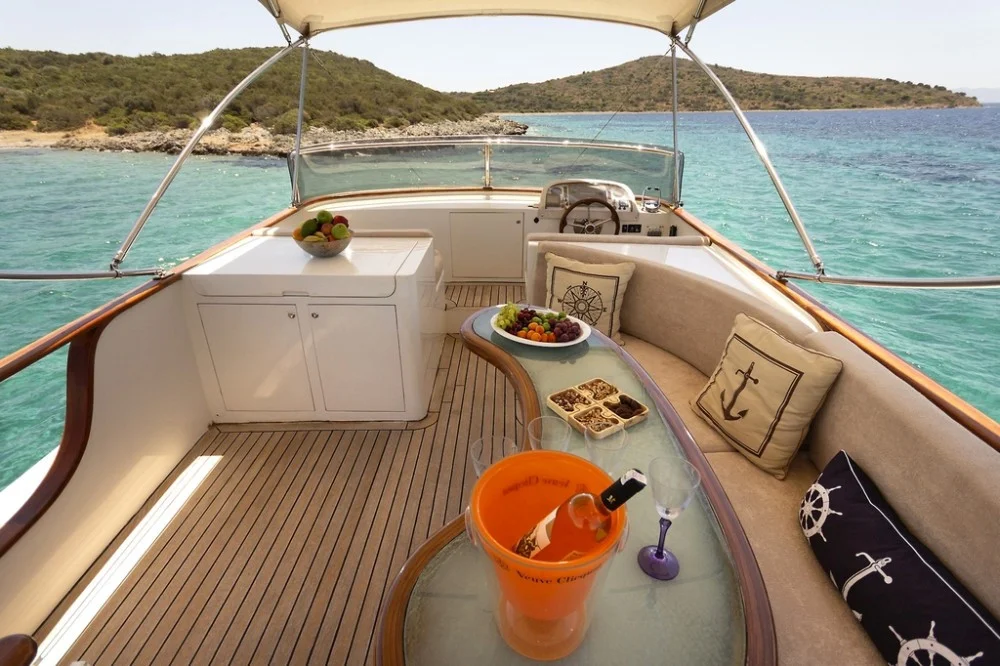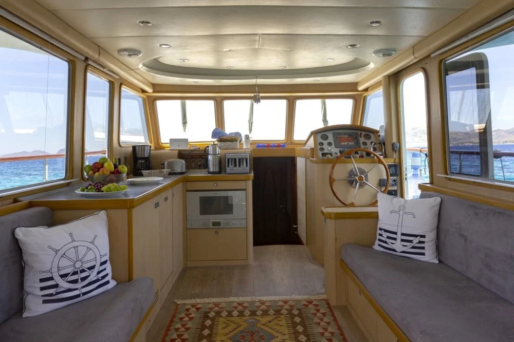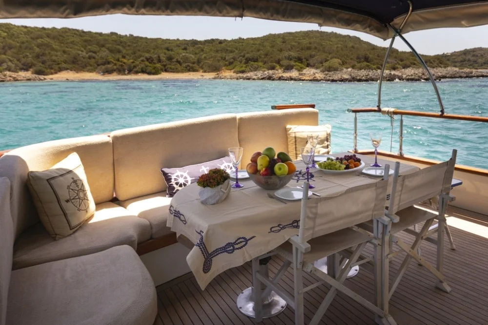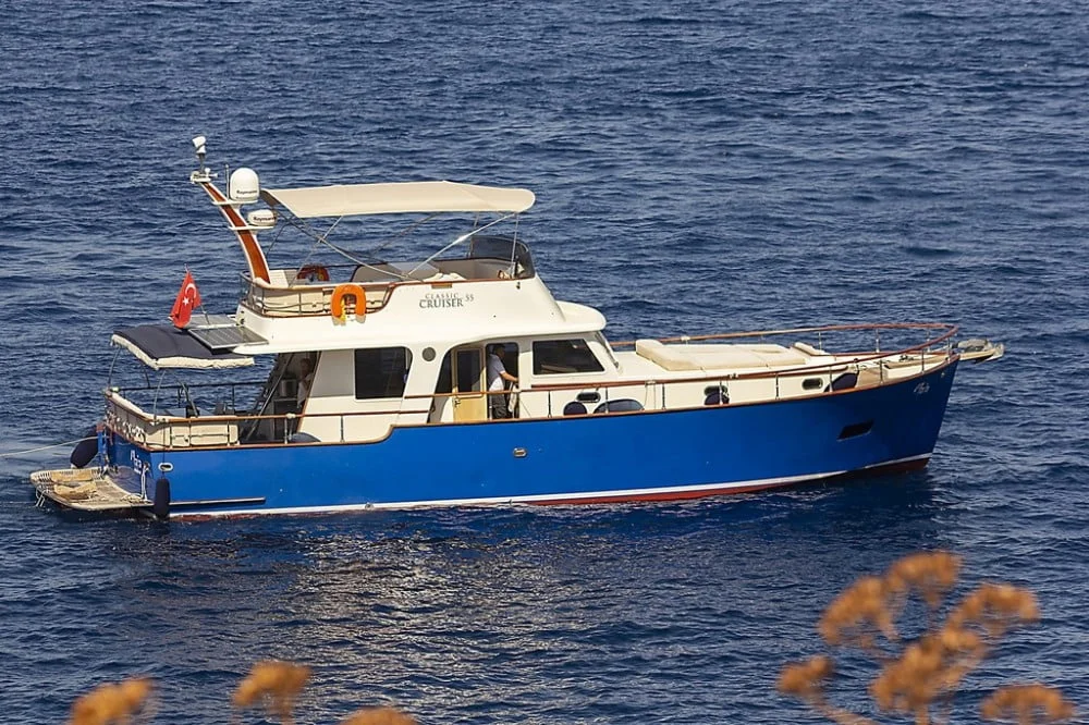 MAIA trawler is a custom-built Classic Cruiser 55 yacht located in the harbour of Bodrum and she is Turkish flagged. With her harmonious exterior and interior design, she is an enchanting trawler. MAIA yacht is ideal for couples and small parties to enjoy their yacht holiday along the Aegean coastline. Her length overall is 17 meters with a beam of 4.60 meters. She owns 2 engines of 265 hp and 2 generators of 17.5 kW. One of the biggest advantages is her platform with a stair that allows easy access to the sea and creates herewith a ‘secret’ sitting area. The sundeck is spacious and offers al fresco dining and sunbeds. Her flybridge is highly recommendable with a relaxing lounge area and 360-degree breathtaking views. MAIA trawler yacht can accommodate 4 guests in 2 comfortable cabins. On the main deck forward is the spacious master cabin with its ensuite bathroom including a shower and WC. The double cabin is perfectly suitable for two guests to accommodate or even for single-use. As for entertainment, the saloon offers a built-in television with IP TV and a DVD player. For other media connections, MAIA yacht offers Wi-Fi onboard. MAIA is very suitable for honeymoon and sunset tours on the boat as well. Please contact us directly for availability and inquiries about trawler yacht MAIA.